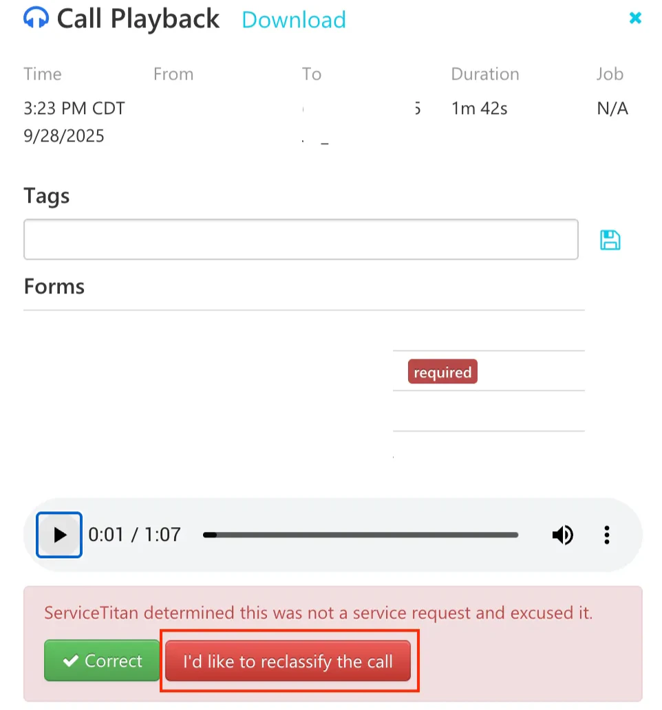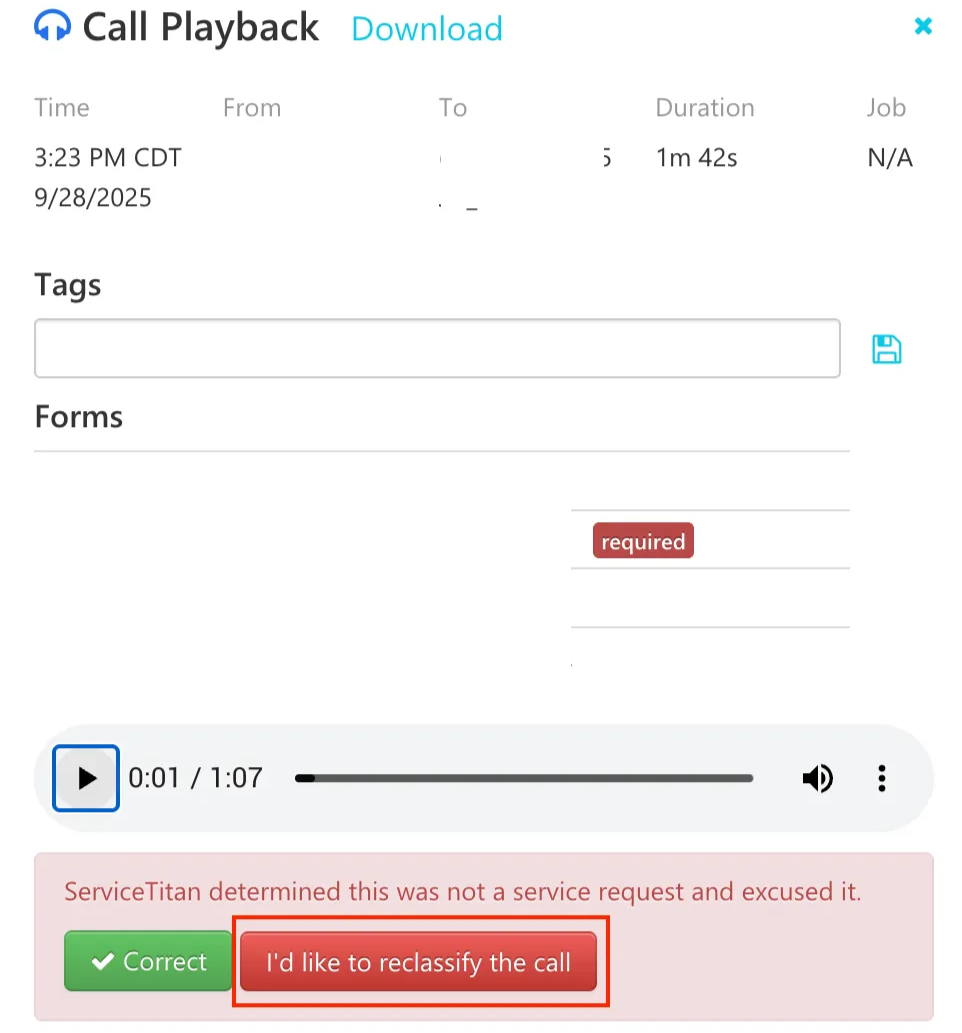 | Auto Call Types Reclassification | Reclassify calls automatically and update call type on Service Titan | This basically maps to the ServiceTitan options: - Excused: This was not a service request. Excuse it. - Unbooked: This was a service request that was not booked. - Not Lead: This call was related to an existing job - Booked: A job was booked for this call. |