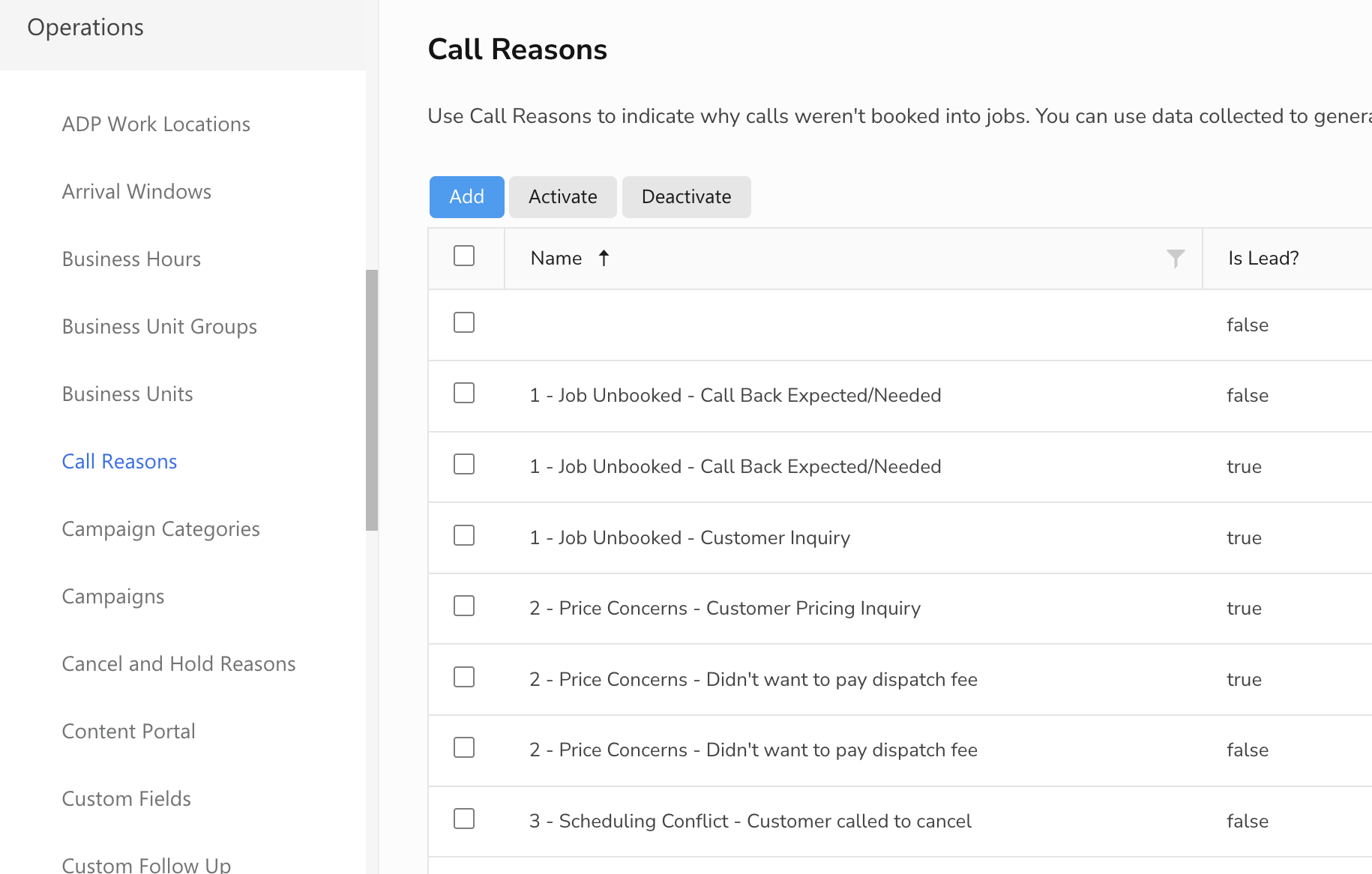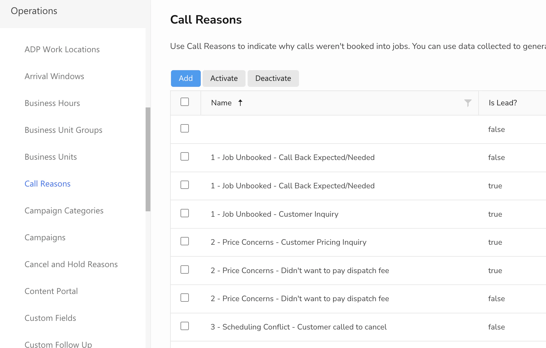 By syncing your call reasons from ServiceTitan, Avoca can provide a suggested call reason for each call. This feature is only helpful if you actively use call reasons to classify calls in ServiceTitan. You can confirm this by checking ServiceTitan > Settings > Operations > Call Reasons to ensure your reasons are set up and active.