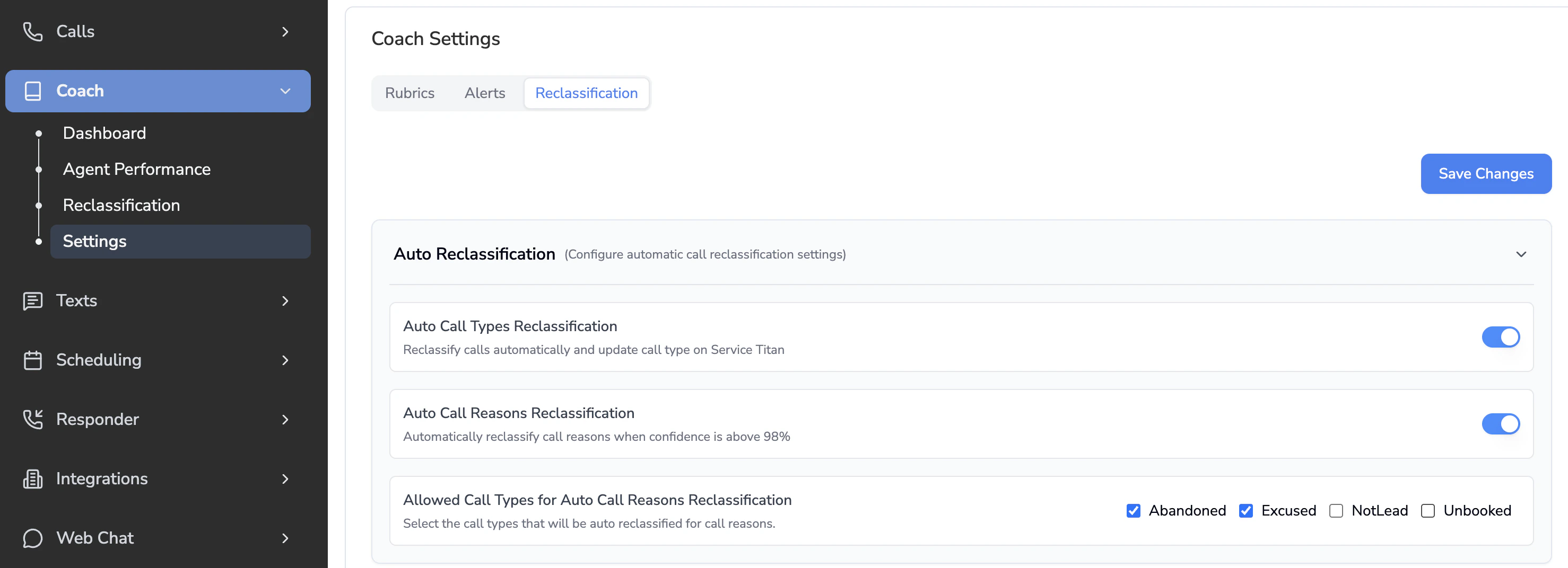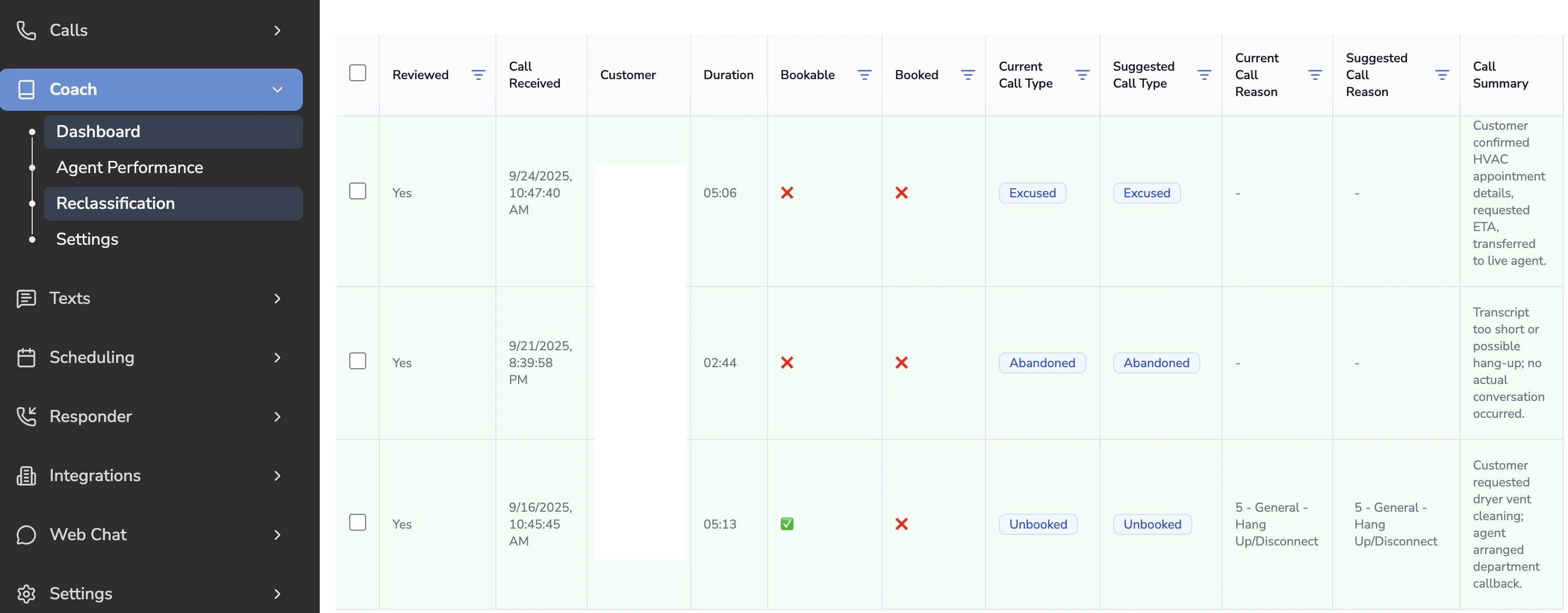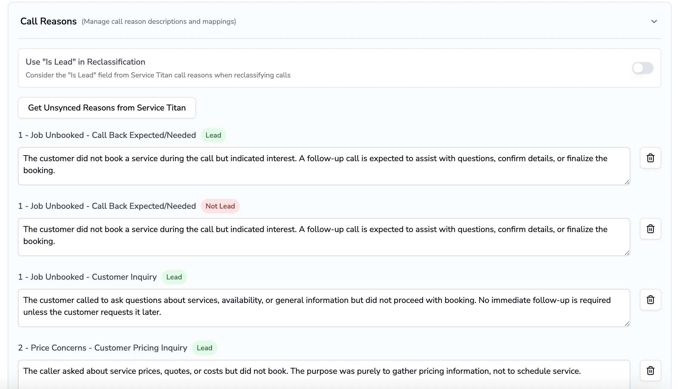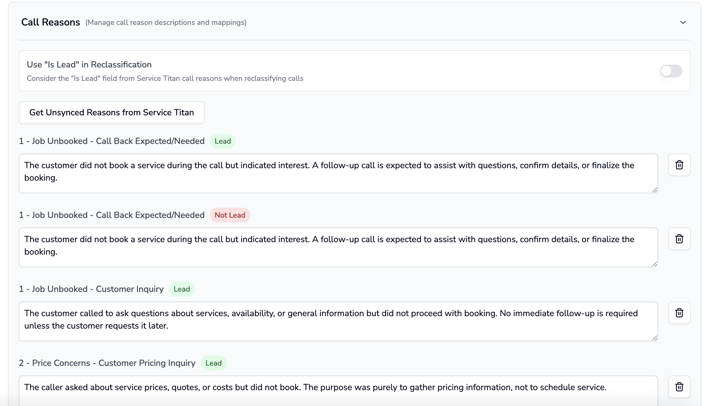 | Use “Is Lead” in Reclassification | Consider the “Is Lead” field from Service Titan call reasons when reclassifying calls | If enabled, when the AI Reclassification Tool suggests a call reason, it will also reference the “Is Lead” field tied to that call reason to determine whether the call was bookable. This takes precedence over your existing Bookability Criteria. We recommend turning this on only if your team heavily relies on the “Is Lead” field in ServiceTitan call reasons and those fields are set up correctly. |
