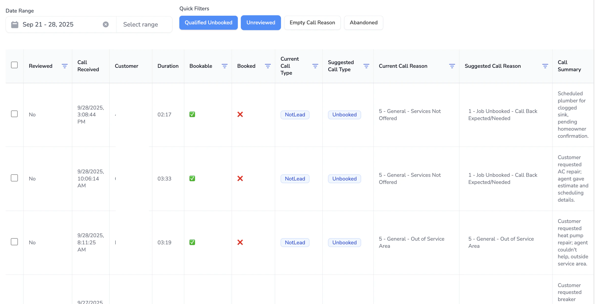- Qualified Unbooked: Shows calls that were qualified leads but not booked.