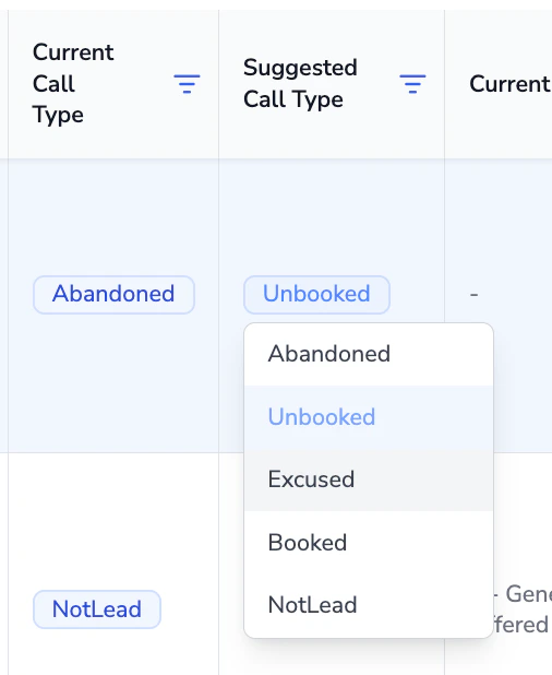 - If you disagree with the AI but want to change the call type, click the Suggested Call Type to open a dropdown of options.