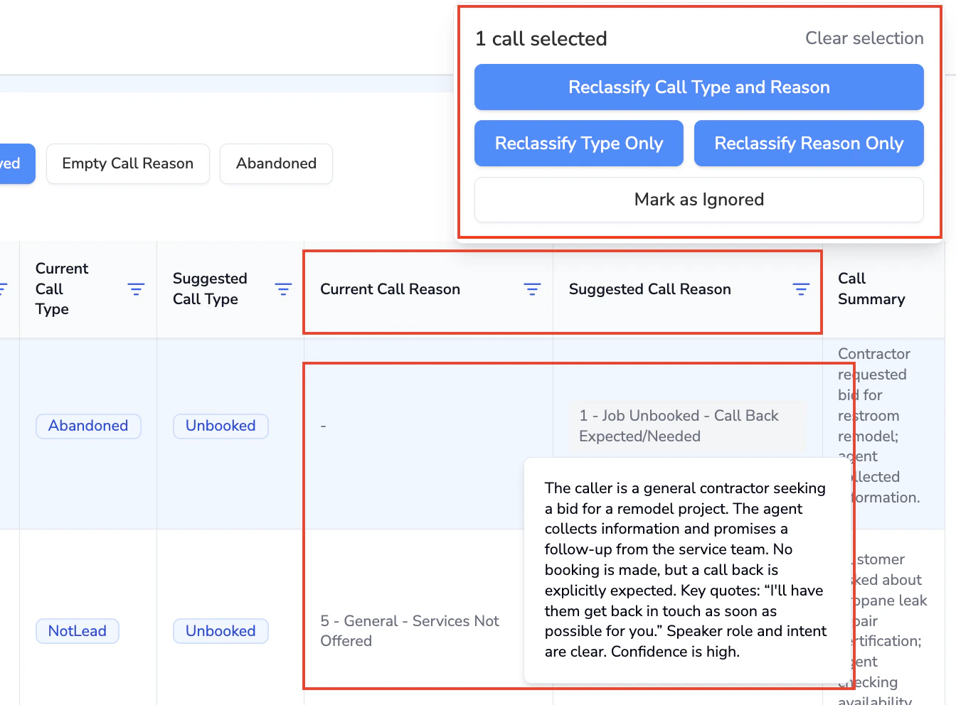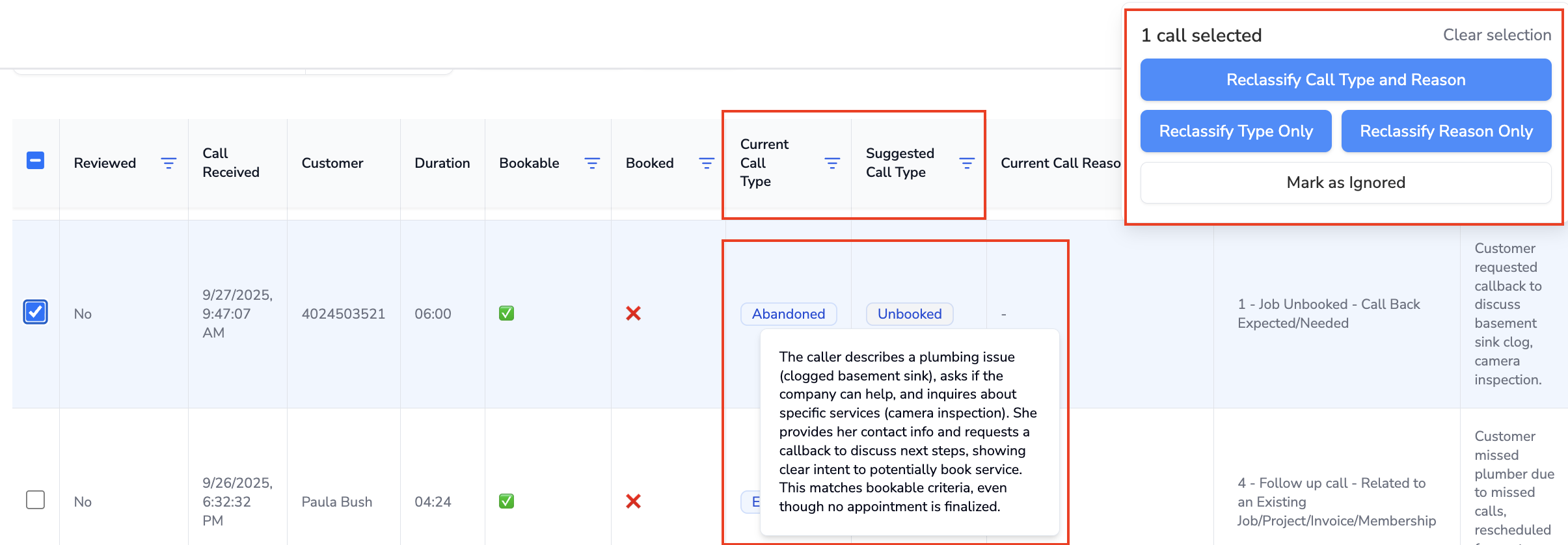 - If you agree with the suggested reason, select the call and choose either Reclassify Reason Only or Reclassify Type and Reason.