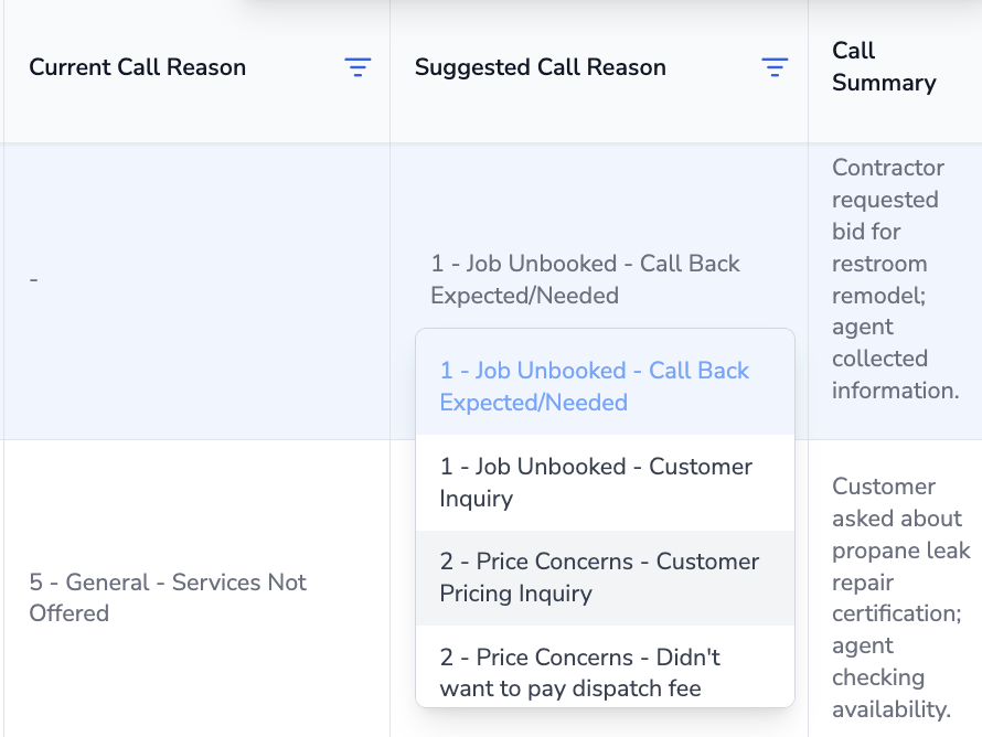 - If you disagree with the AI but want to change the call reason, click the Suggested Call Reason to open a dropdown of options.