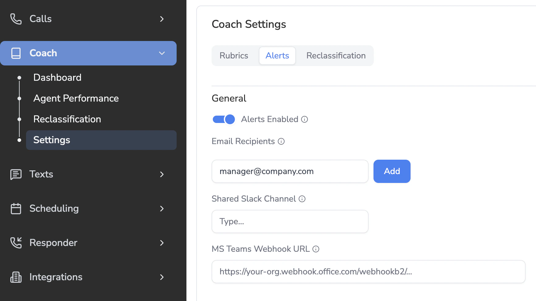 To ensure no leads are missed, you can set up alerts for qualified bookable leads that weren’t booked during the call. This allows your team to quickly follow up with the caller and close the opportunity. To set up notifications, go to Coach > Settings > Alerts