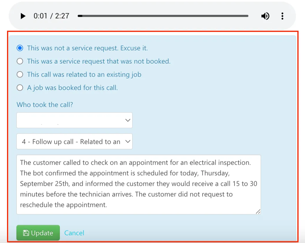 Reclassification helps ensure every call is reviewed objectively to determine if it was a true bookable lead. With this tool, you can update the call type and reason directly from the Avoca dashboard (basically the same information you’d typically input in the call review process, as shown in the screenshot below) and those updates will sync seamlessly into ServiceTitan. Accurate call classification is essential for tracking your company’s booking rate and evaluating your team’s performance with confidence.