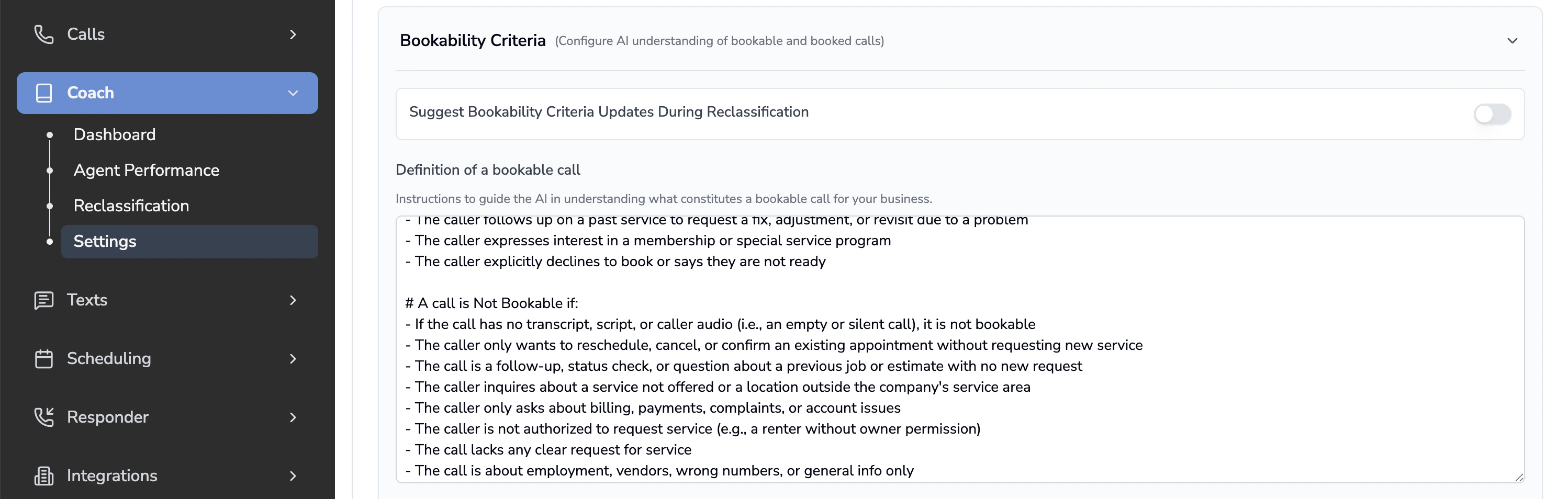 | Suggest Bookability Criteria Updates During Reclassification | If enabled, the AI will suggest updates to your Bookability Criteria whenever you reclassify a call using a custom selection instead of the AI’s recommendation. | By default, this setting is off and should only be enabled during the initial fine-tuning stage of your reclassification audit. |