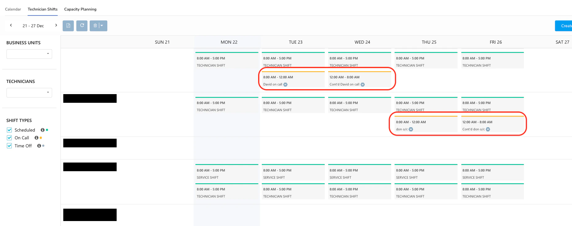 Ensure that moving forward, you always maintain an accurate calendar of your on-call technician shifts within ServiceTitan. You can do this by going into your ServiceTitan, clicking Schedule at the top of the screen, and going to Technician Shifts. You should see yellow shifts during emergency hours for all the technicians who will be on-call that week.