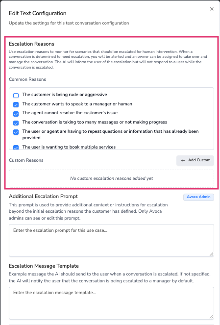 Escalation Reasons Select when you want conversations to be flagged for human review. You can choose from common reasons or create custom ones.