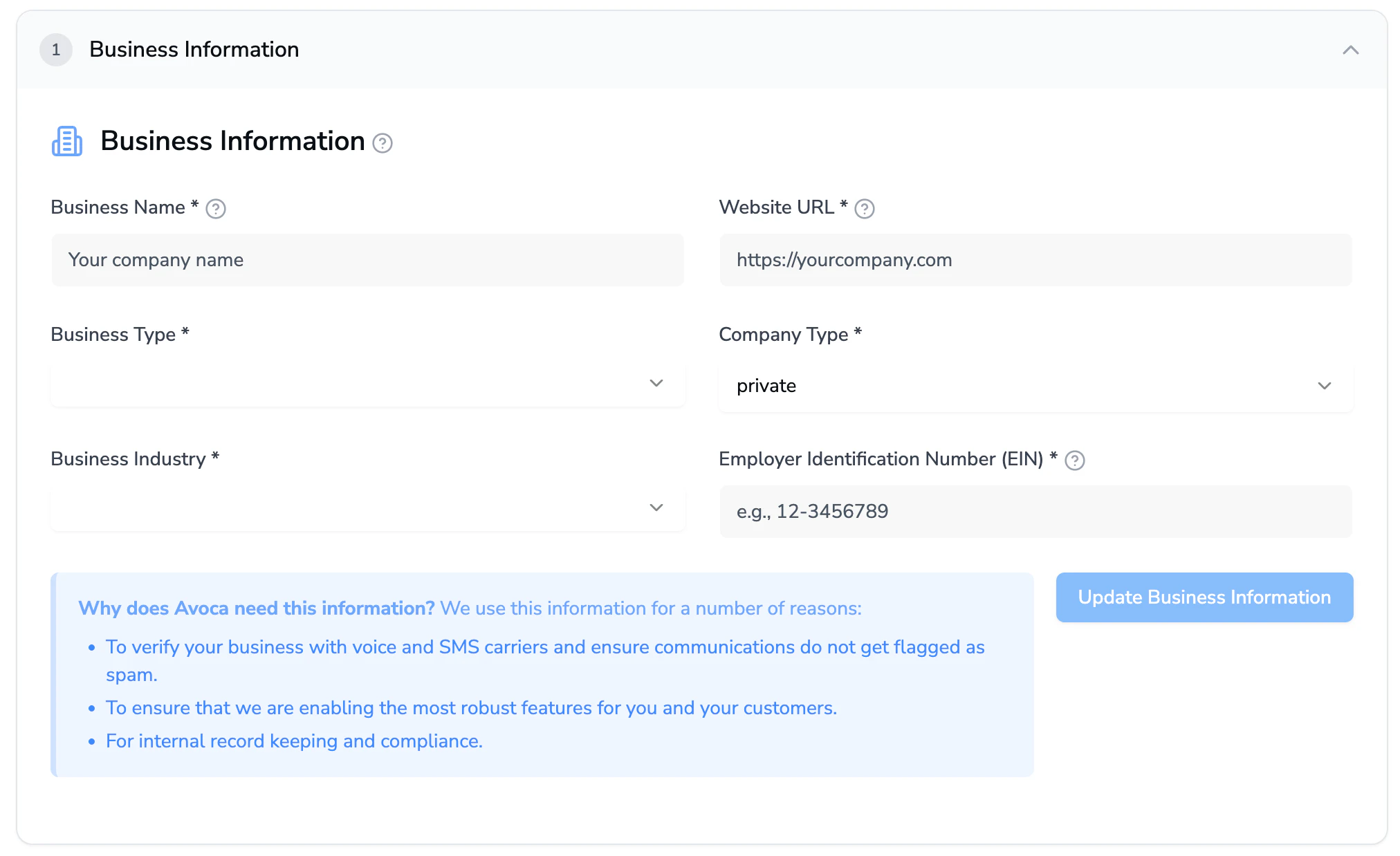 Fill out the Business Information section. The information submitted should match the latest official legal/financial documents of the company.