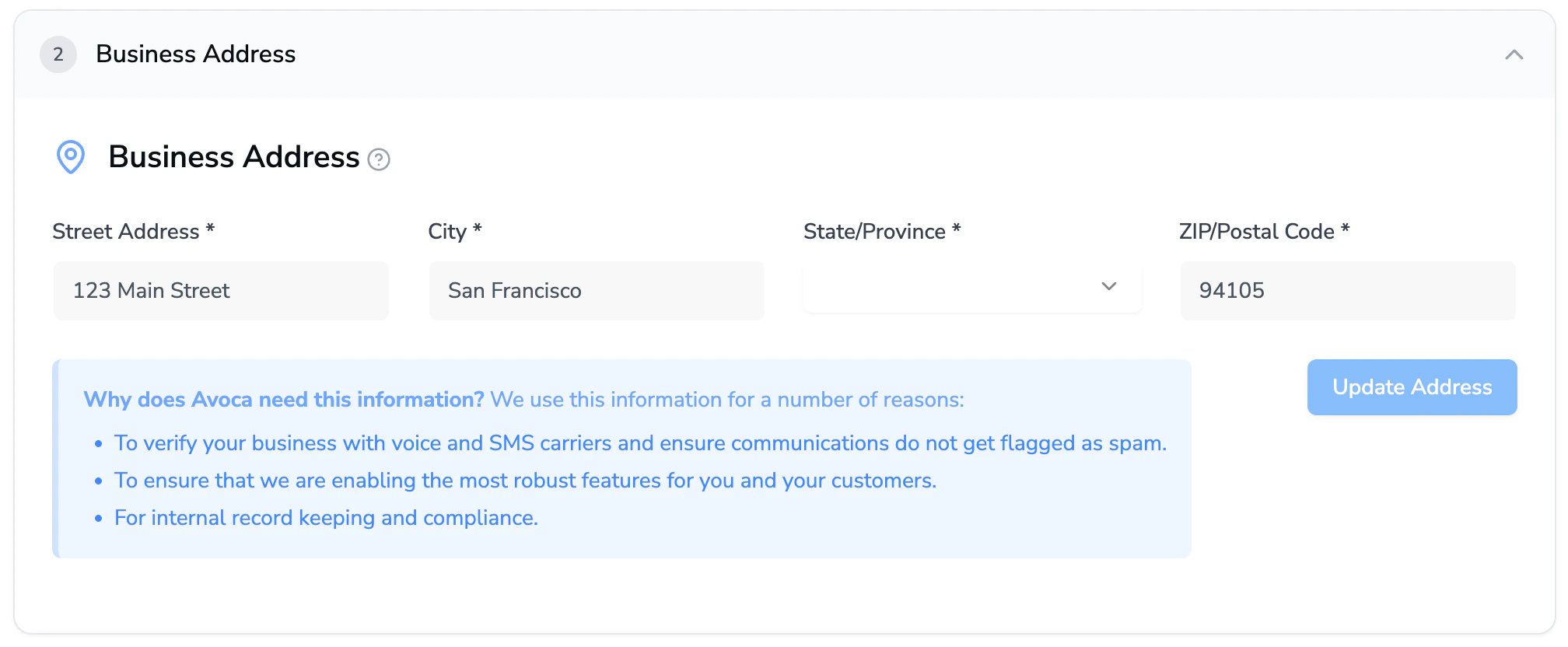 Fill out the Business Address section. The information submitted should match the latest official legal/financial documents of the company.