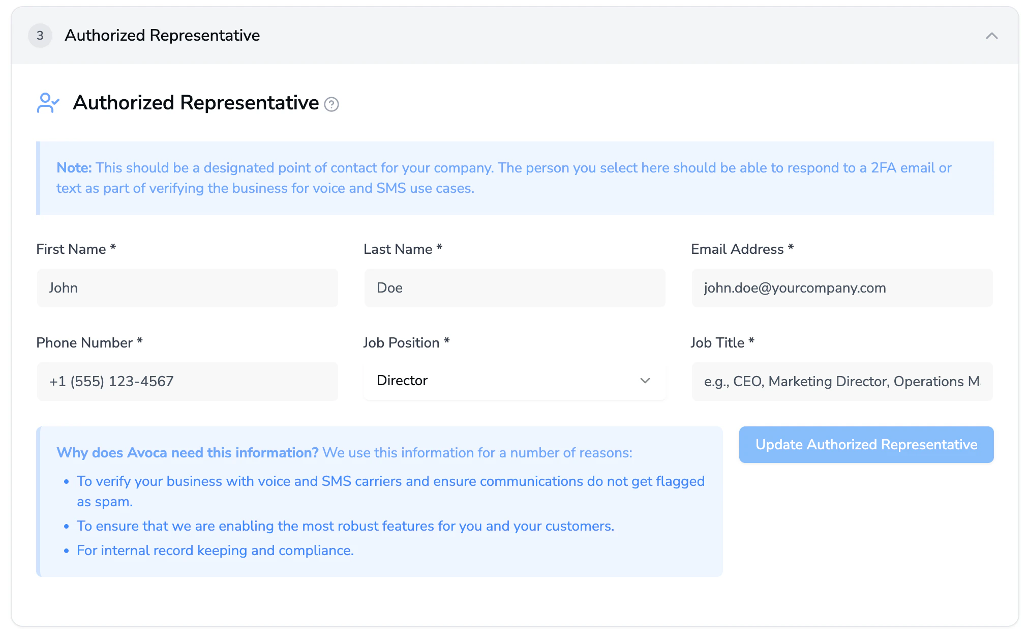 Fill out the Authorized Representative section. The person identified as the authorized representative should be reachable by the phone number and email address provided.