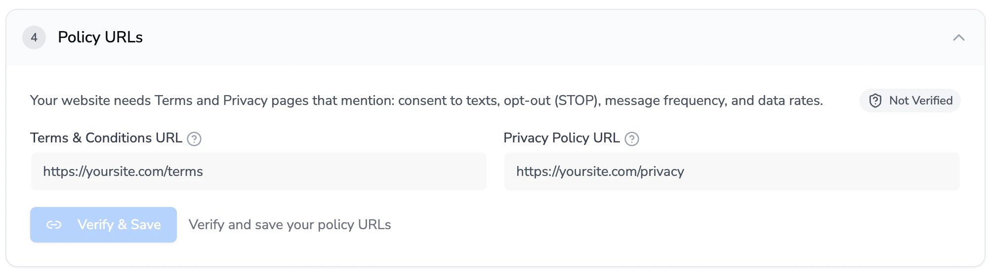 In the Policy URL section, copy and paste the terms & conditions and privacy policy URL’s into the fields. If you are missing either, you can submit the same URL’s for both. Then, click Verify & Save to see if all the criteria are met.