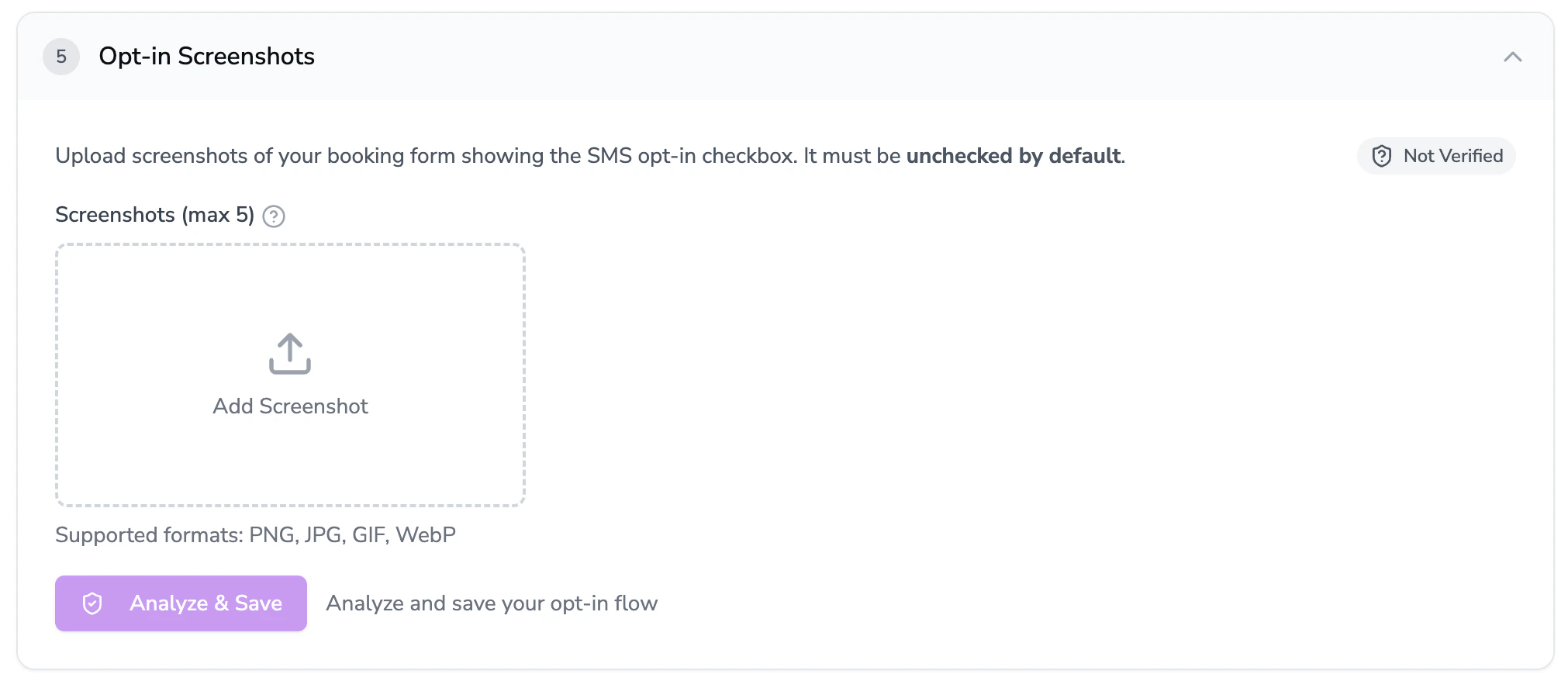 In the Opt-in Screenshots section, take screenshots of your online scheduler, webchat, web form, or any pages that collect opt-in consent. The page you screenshot should include the consent language and unchecked opt-in checkbox.