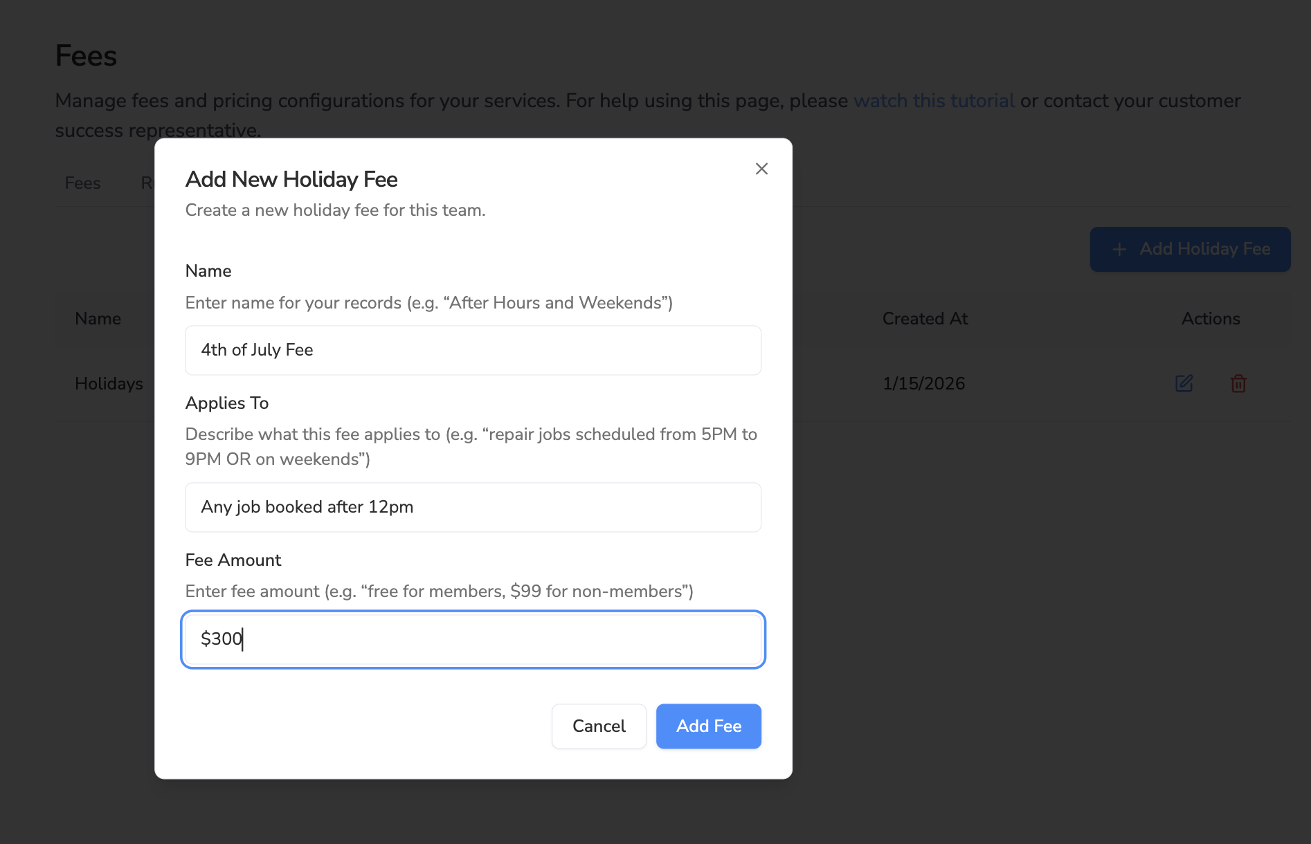 Configure holiday fees (optional) – If you charge different fees on holidays: