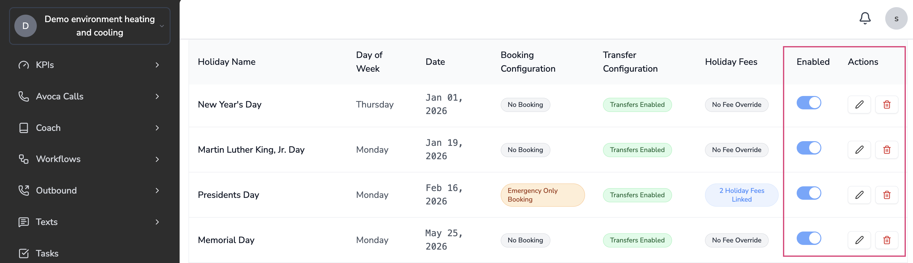 We’ve recently added a self-serve Holidays feature in the Avoca Dashboard that allows you to manage your company holidays directly. By setting up your holidays, you can ensure that your Avoca bot does not overbook your team on these days.For ServiceTitan customers using ACP/AdCap: If you’ve already marked holiday dates with 0 capacity in ServiceTitan, Avoca won’t book any jobs. The Holidays feature provides an additional guardrail and gives you more control over booking behavior.