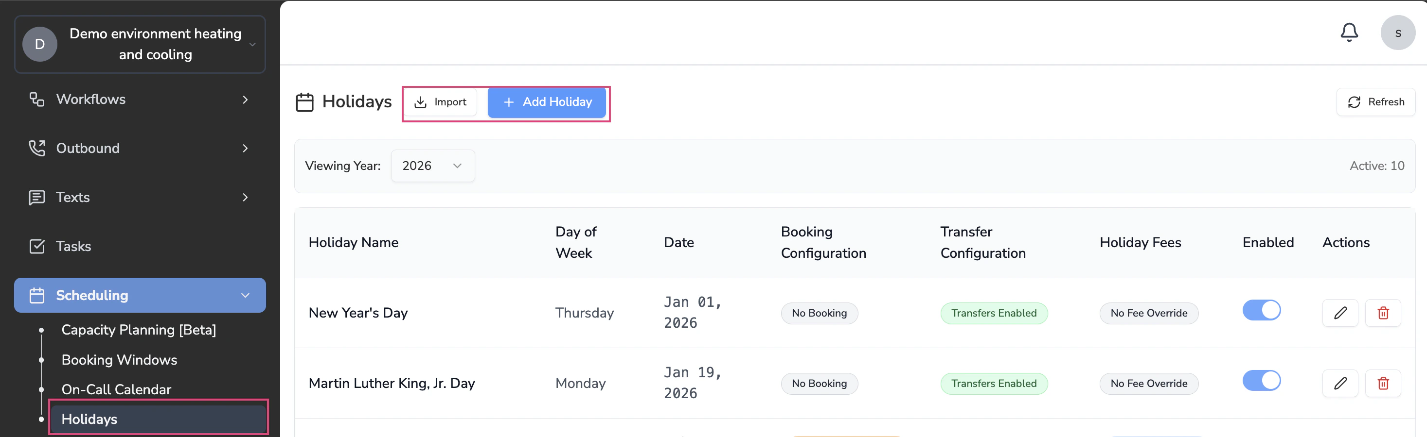 Once you’ve added holidays, they’ll appear in a dashboard where you can view and manage all your configured holidays.