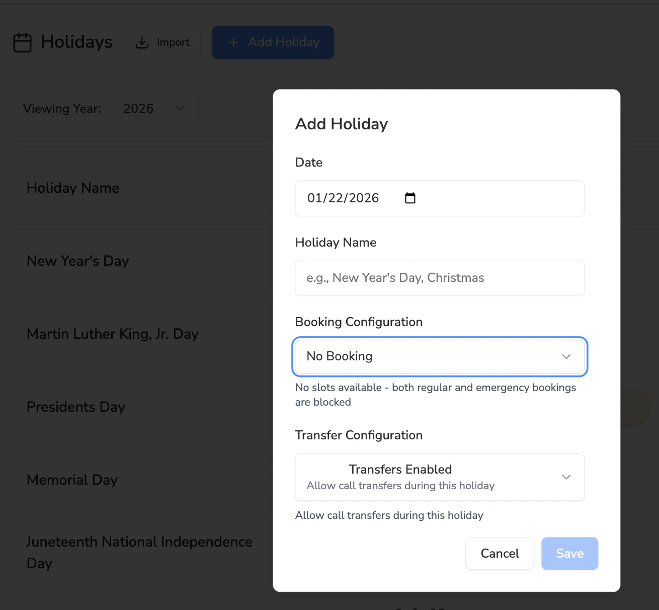 Use this option to quickly add standard federal or public holidays for the year. Steps:Select the year you want to import (e.g., 2025, 2026). This will pull up a list of all the holidays for the year you’ve selected.