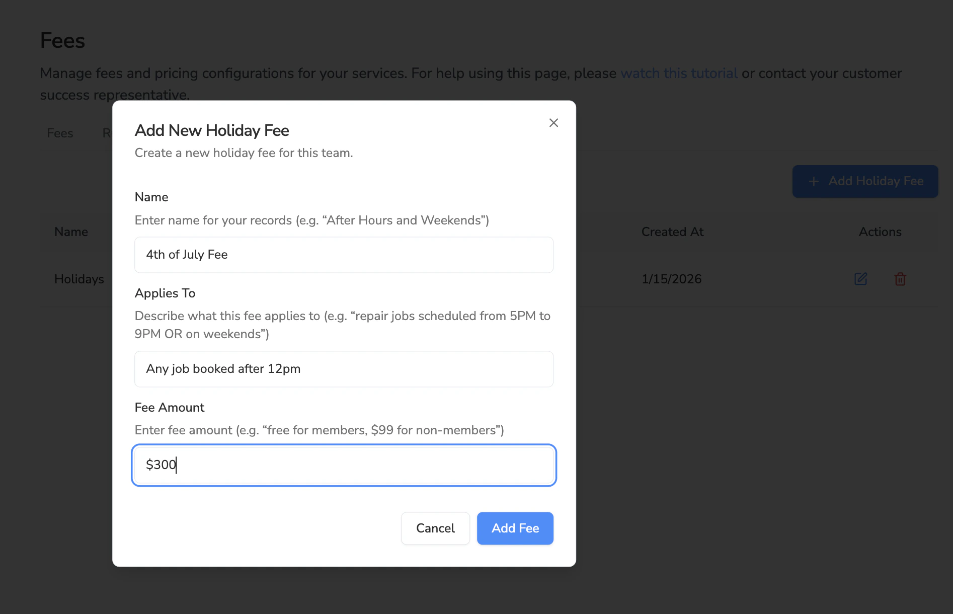 - Holiday fee: “Holiday Emergency Fee - $300” (or your premium rate)