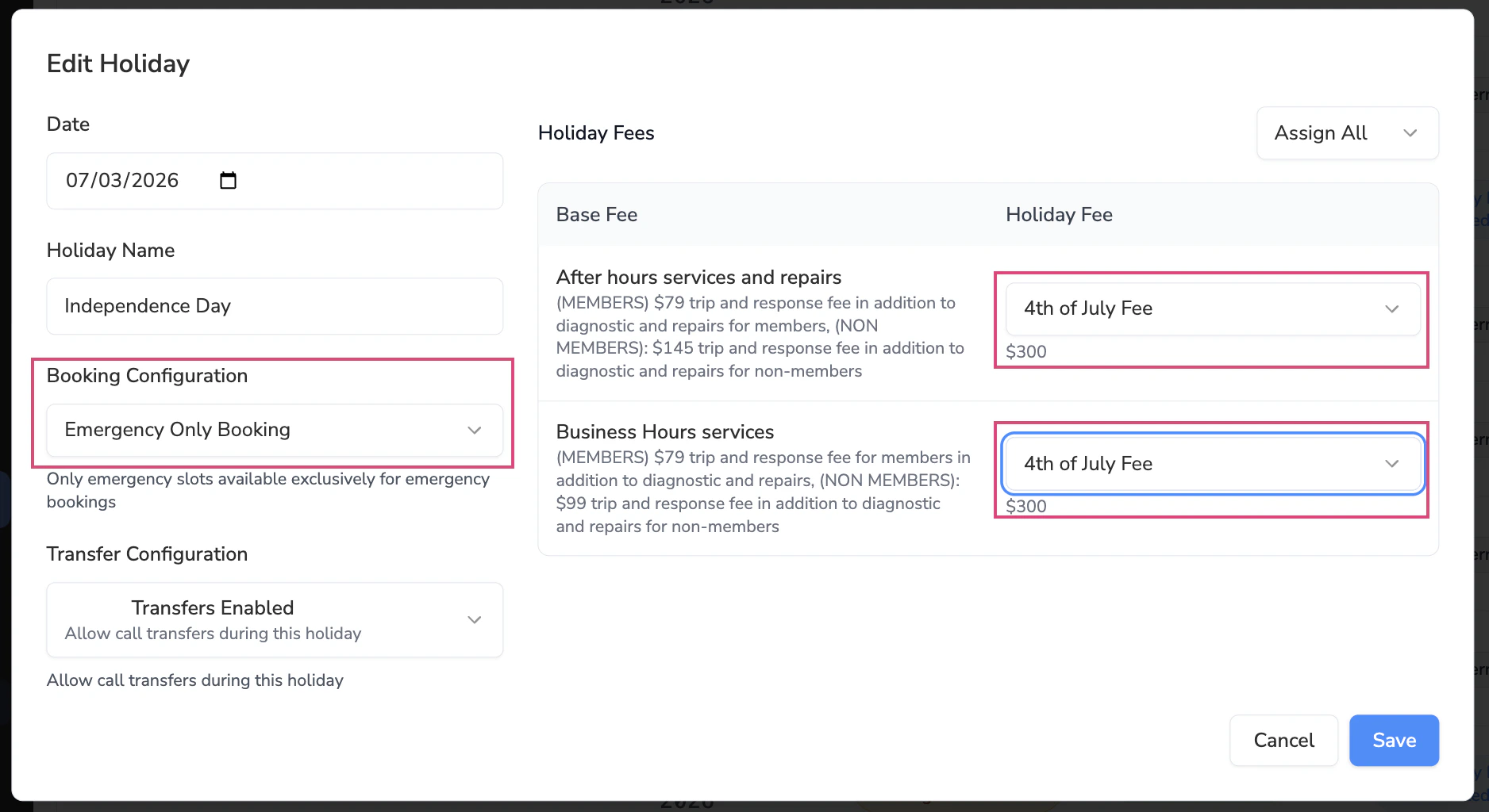 Before you can assign holiday fees to specific holidays, you need to create the fees first:Create your holiday fees (e.g., “Holiday Emergency Fee -