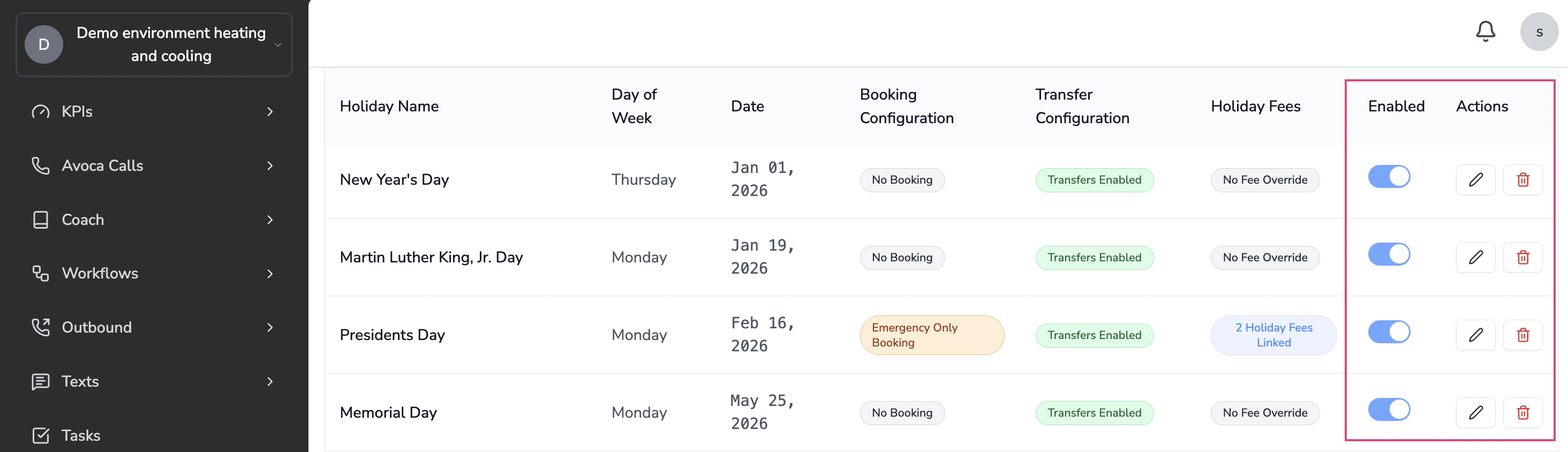- Enabled holidays (default) – When a holiday is enabled, your Avoca bot will respect the booking configurations you’ve set up