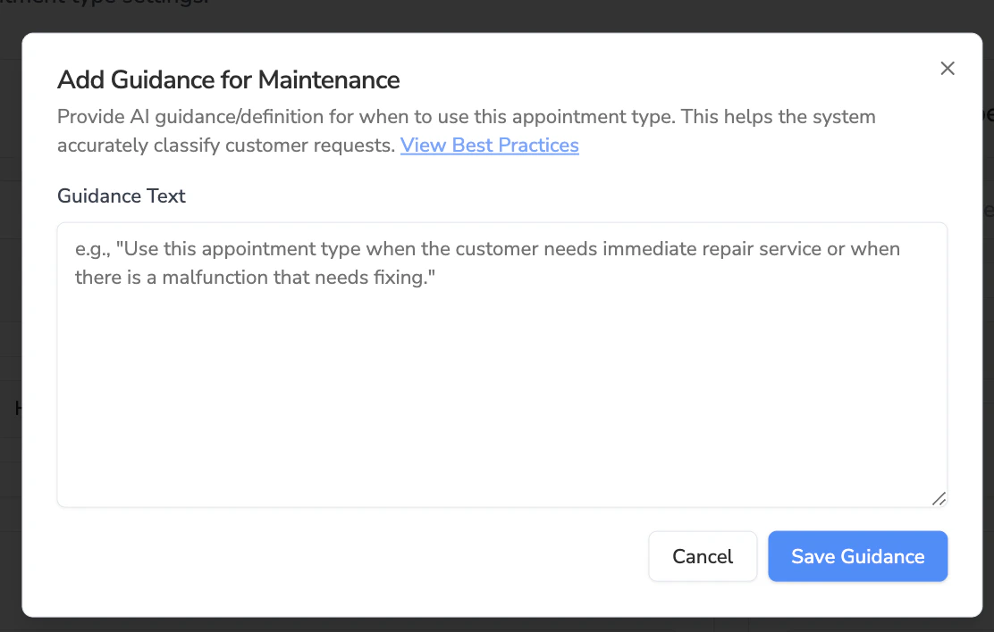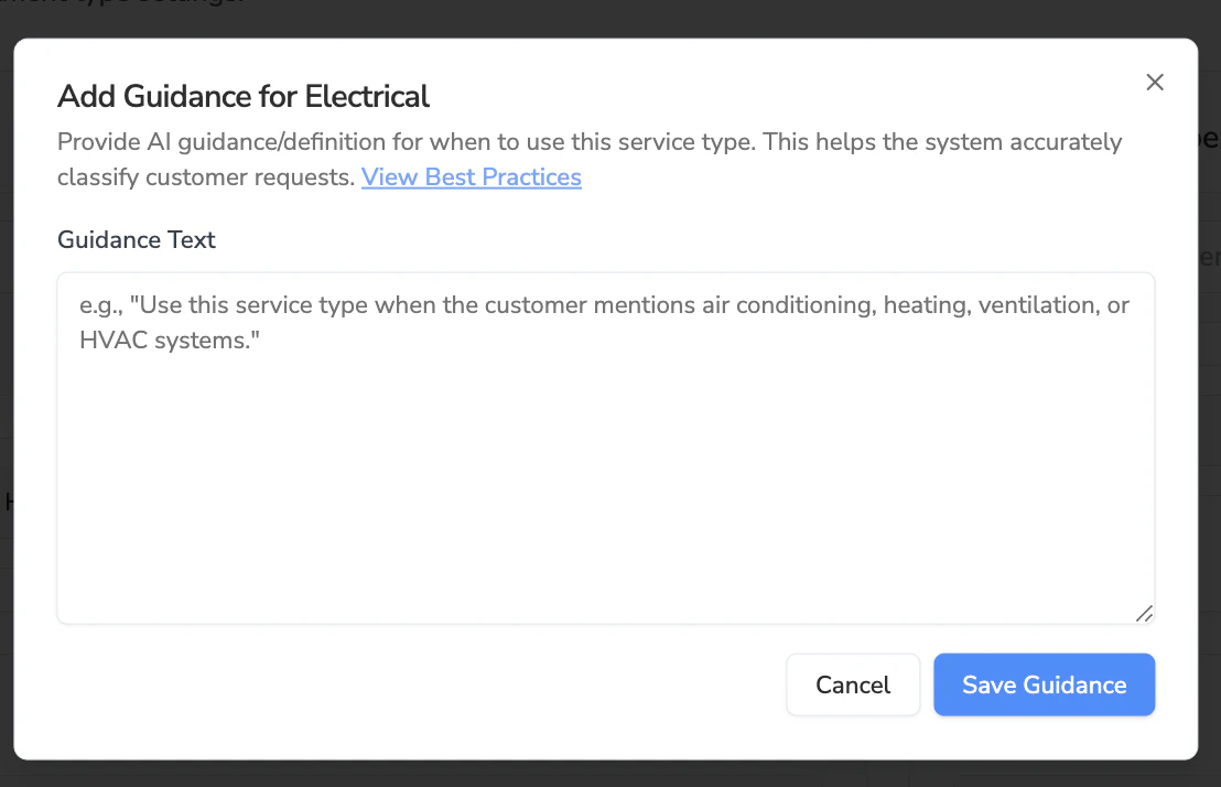 Add guidance any time you see:- The AI selecting the wrong Service Type (e.g., choosing HVAC when the caller needs plumbing).
