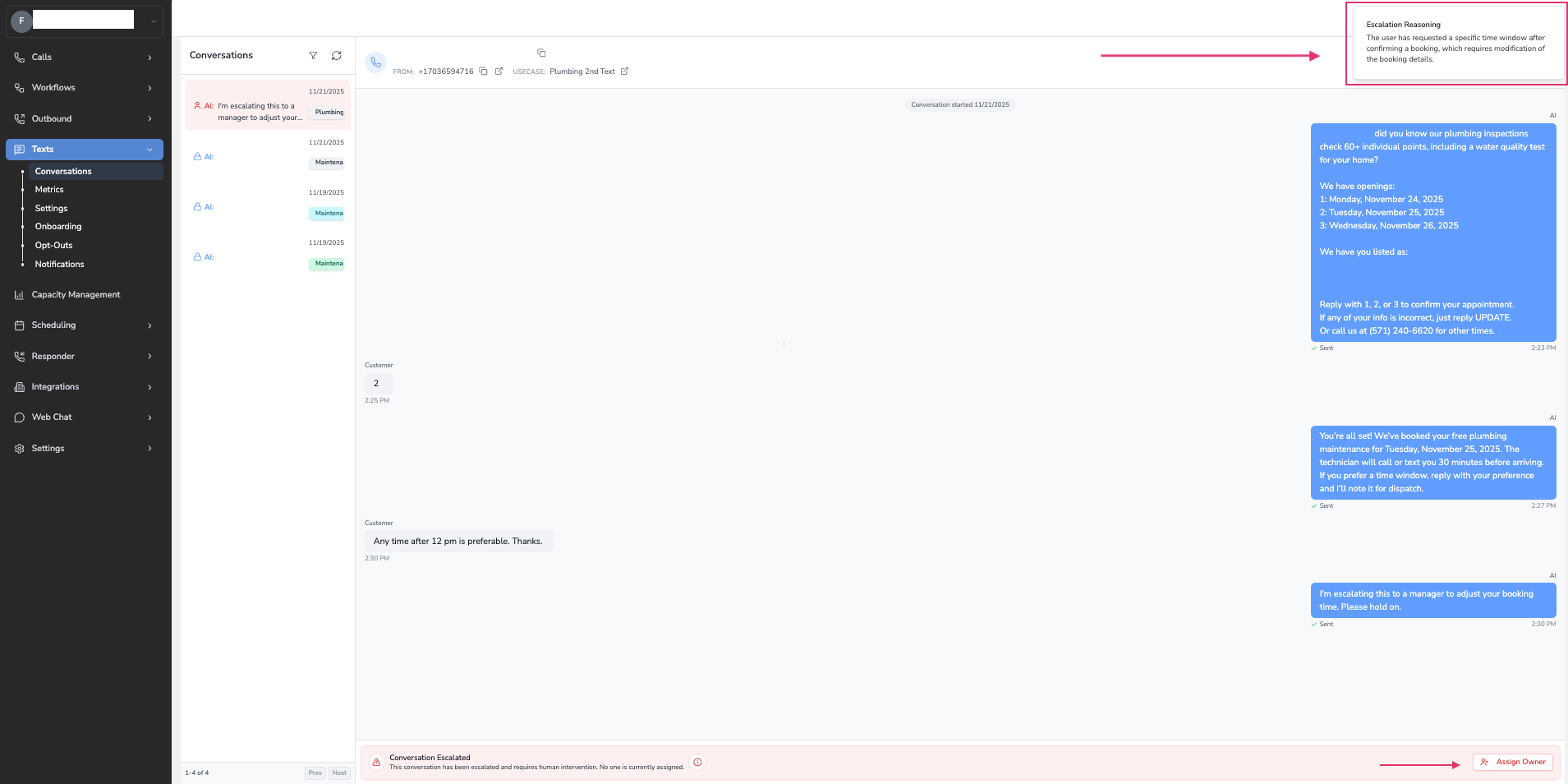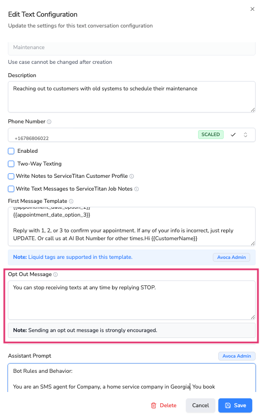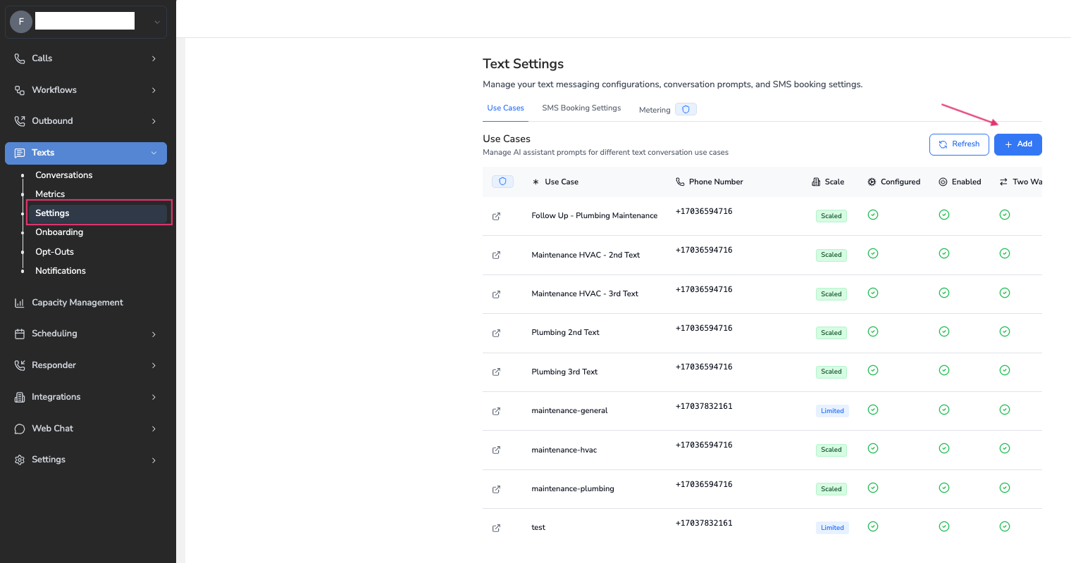 - Two-Way Texting: Enable this if you want the ability to respond to customer messages or take over conversations manually