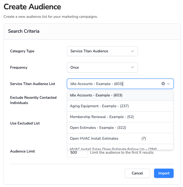 - Import audiences directly from your ServiceTitan Marketing Pro account