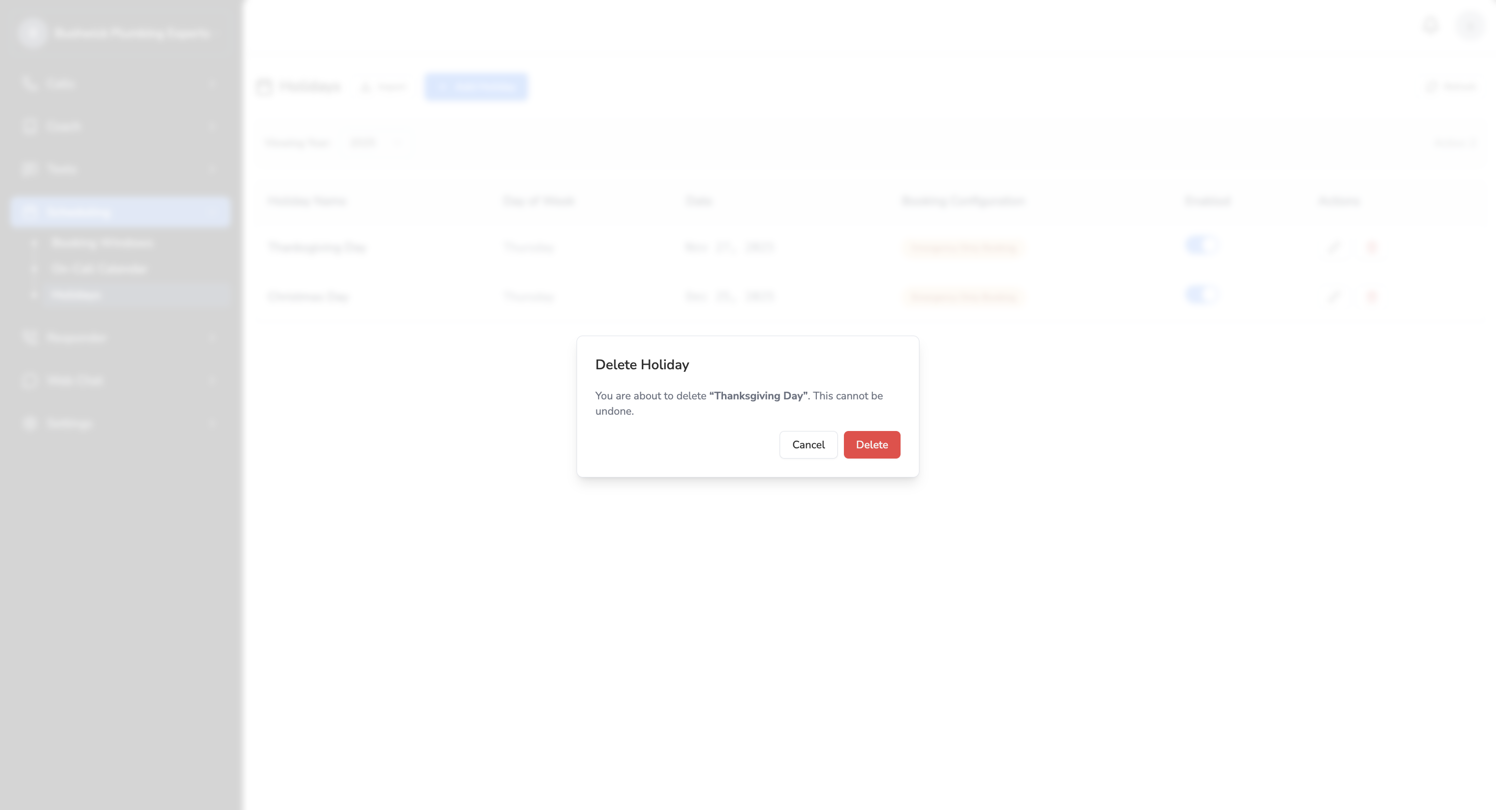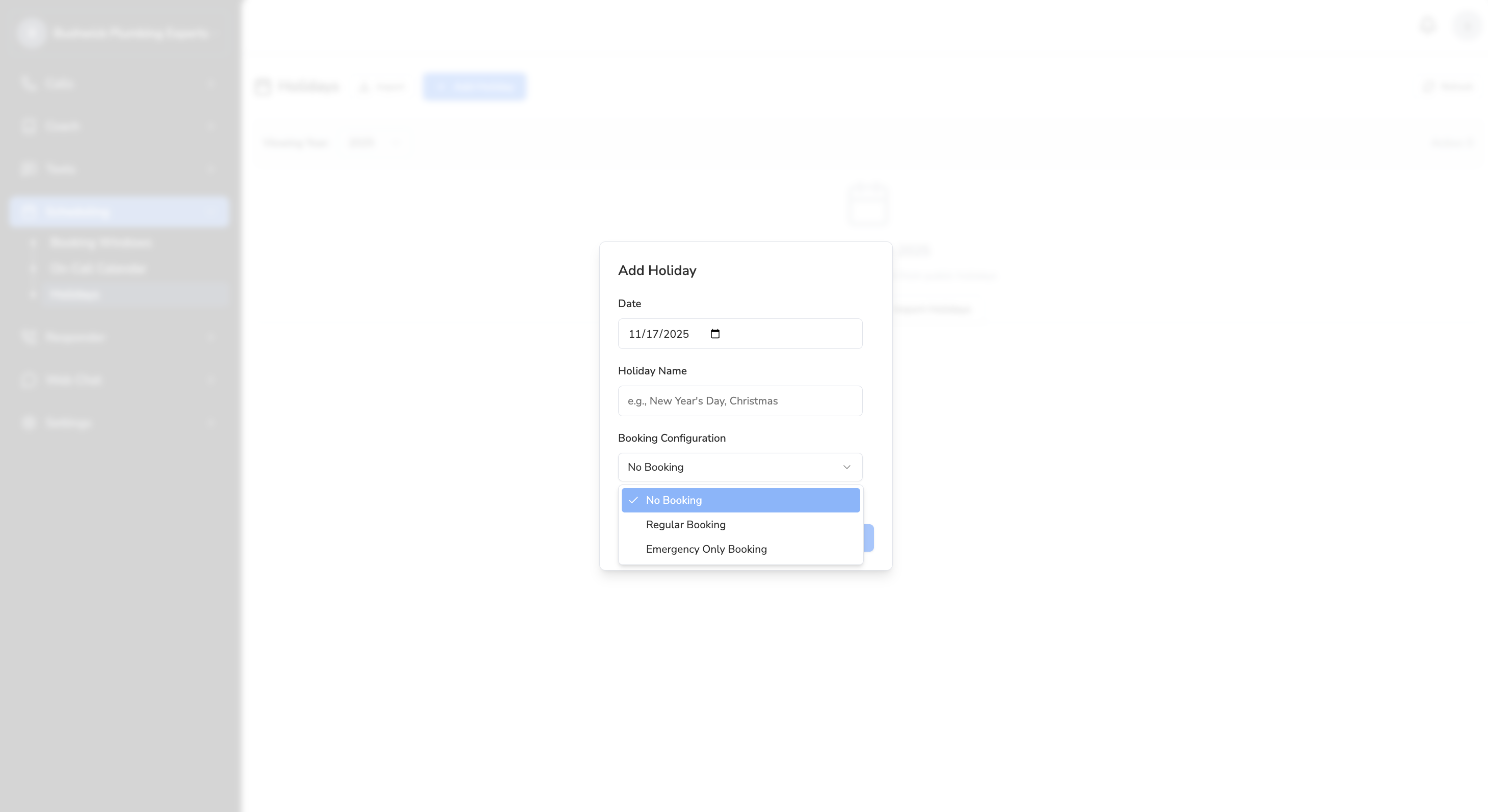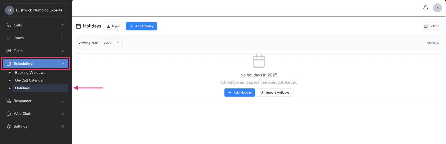 Go to ‘Scheduling’ > ‘Holidays’ on the left navigator. You’ll see two options:- Add Holiday: This will allow you to manually add a specific holiday.