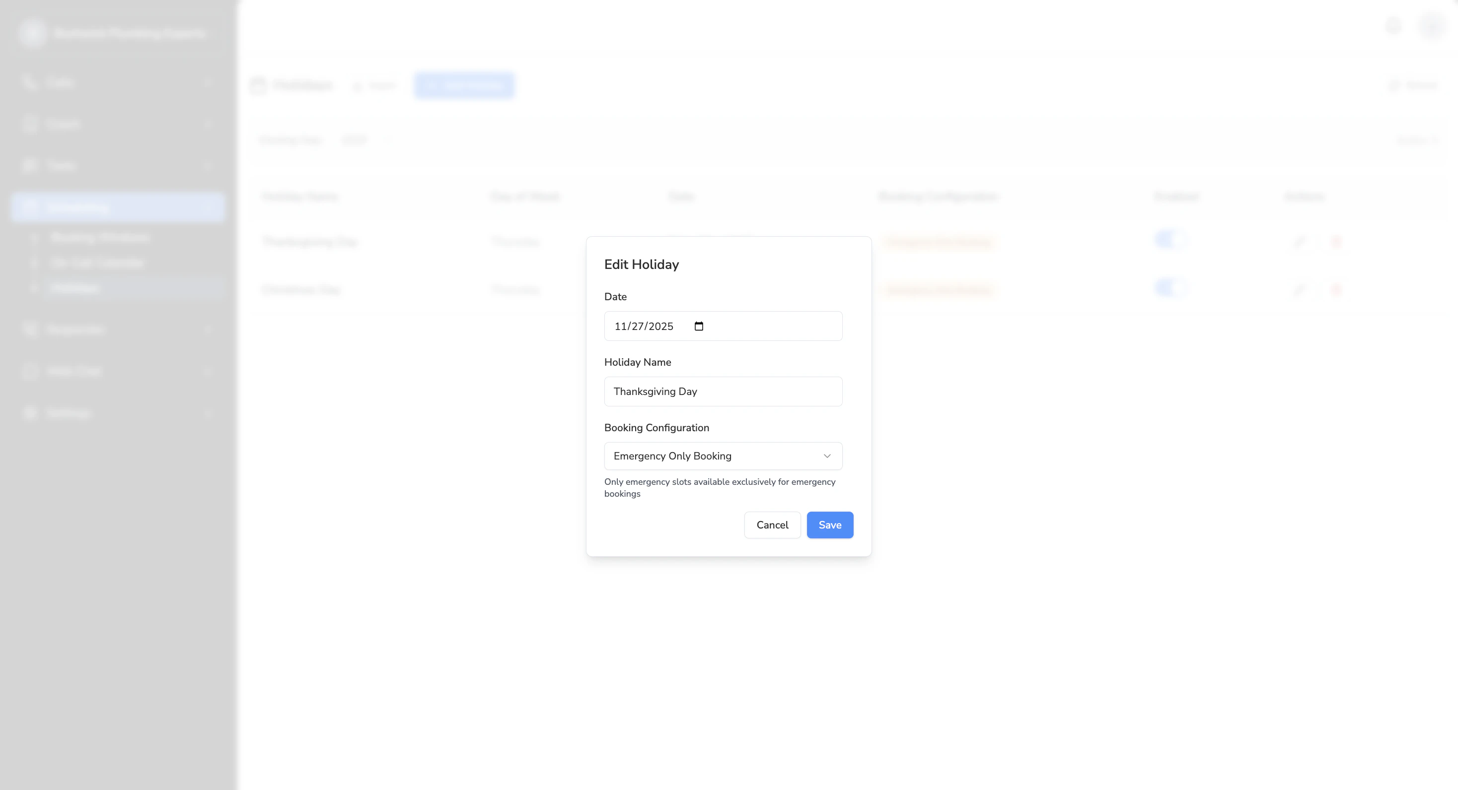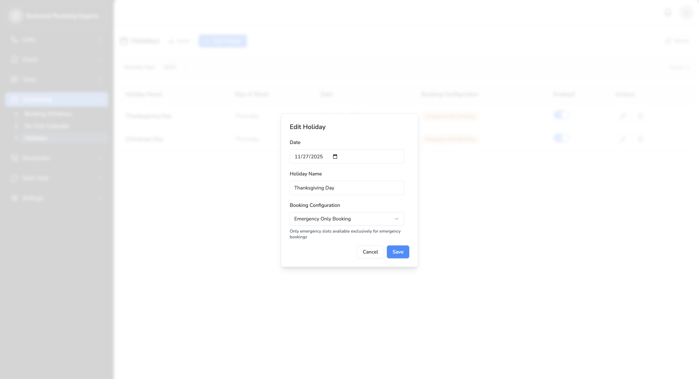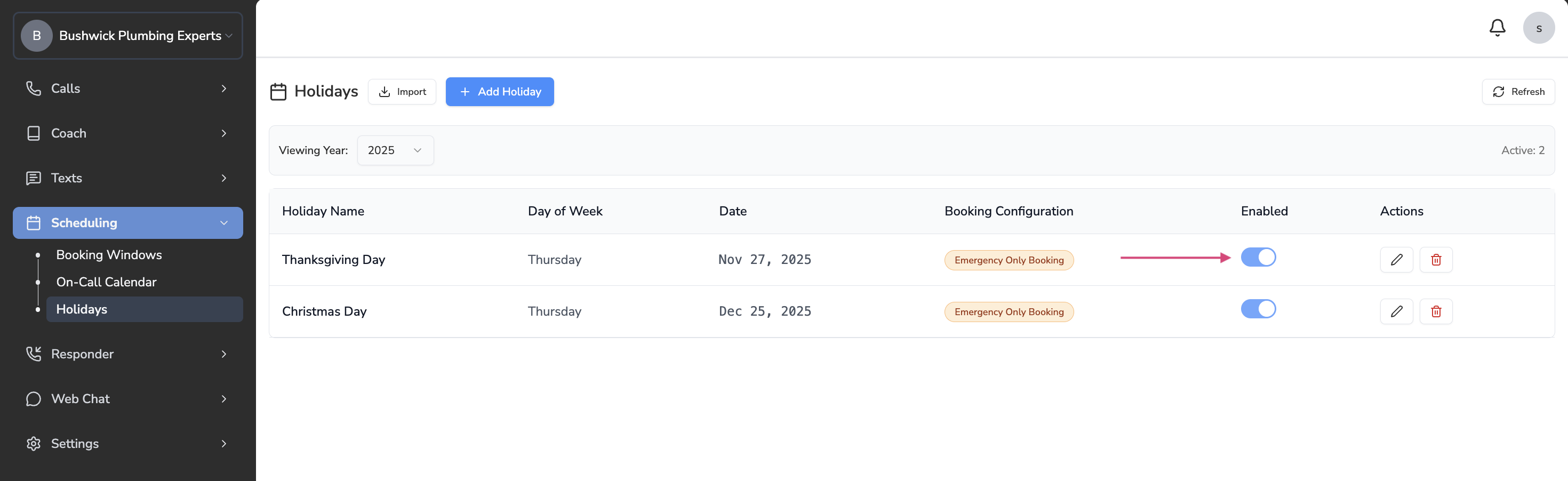 Go to ‘Scheduling’ > ‘Holidays’ on the left navigator. You’ll see two options:- Add Holiday: This will allow you to manually add a specific holiday.