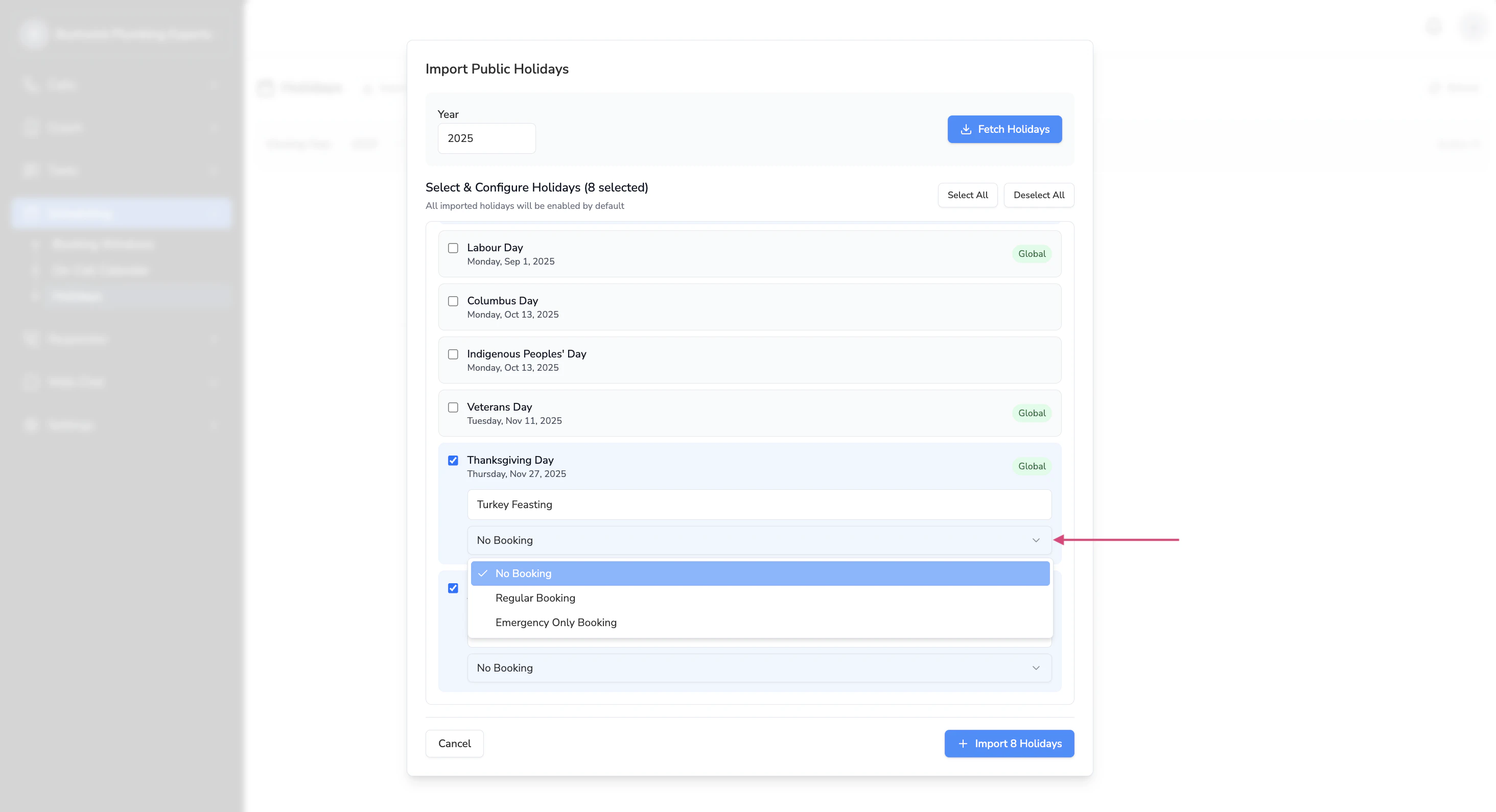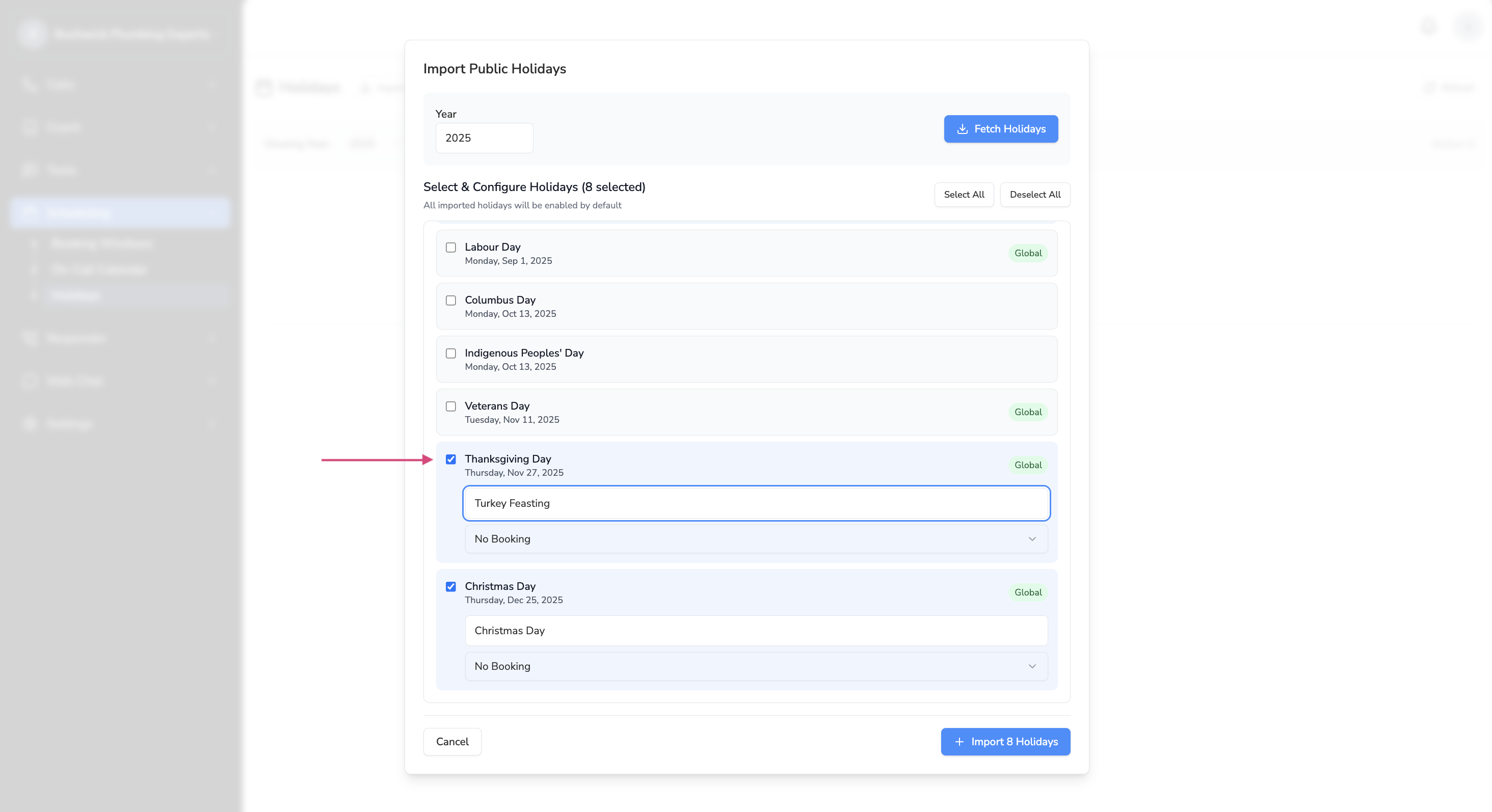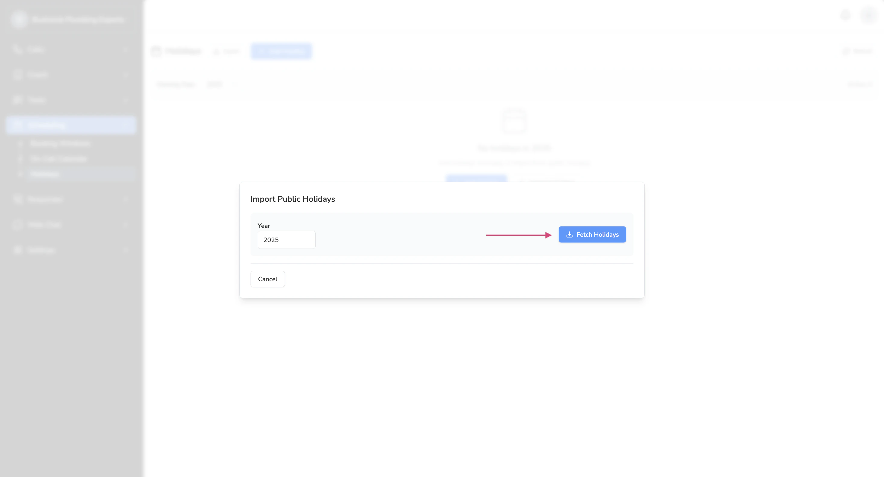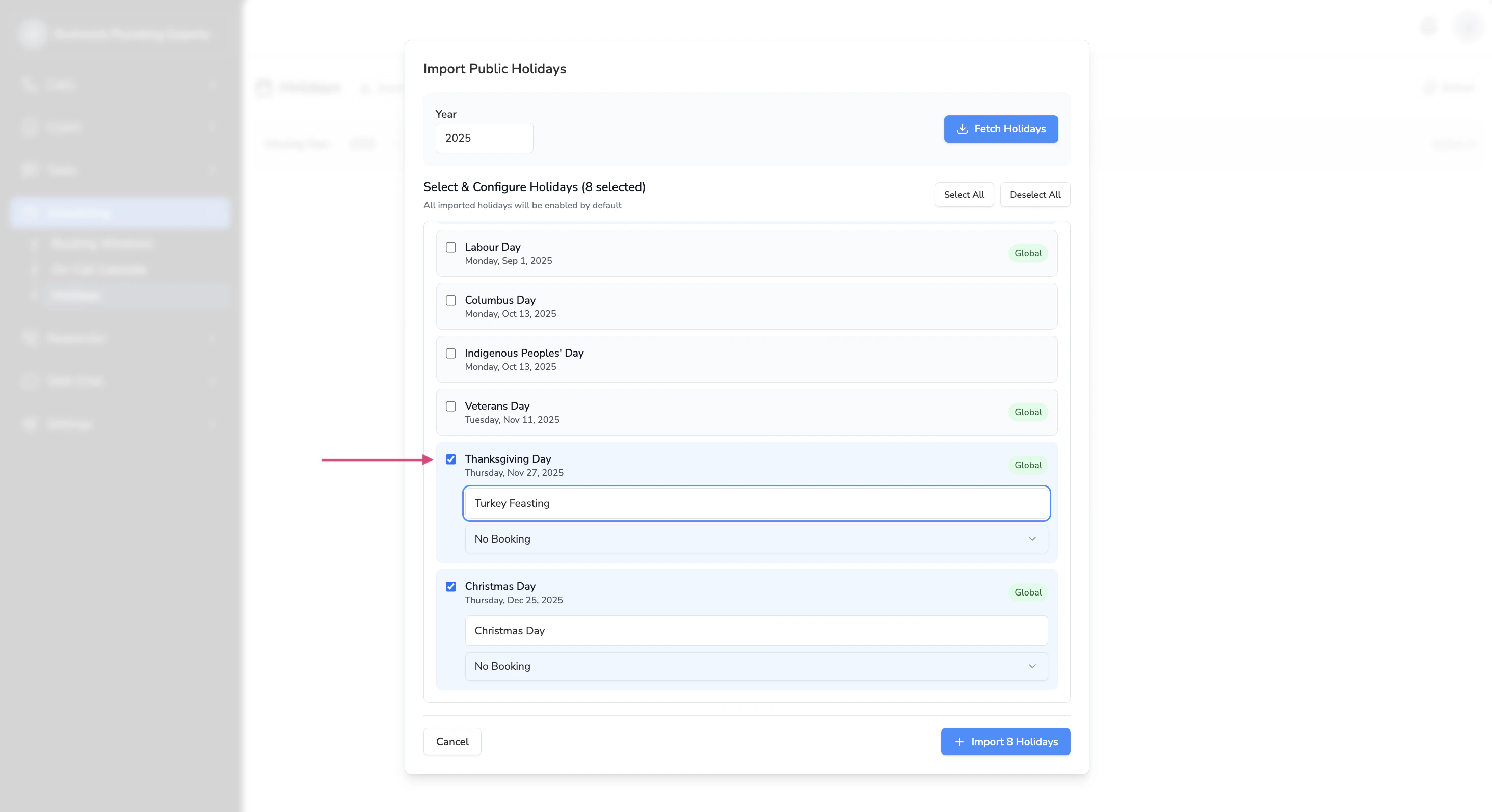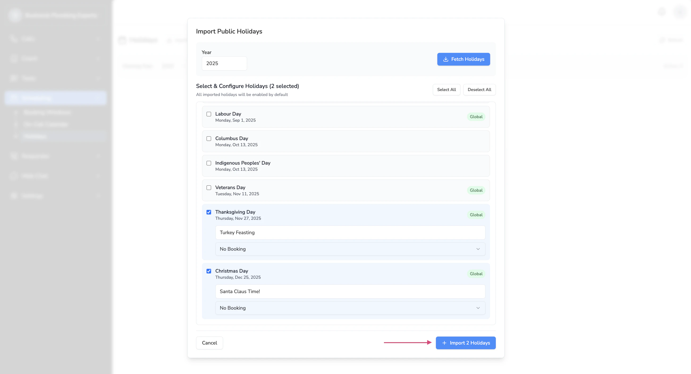 Click on Import Holidays > Fetch Holidays.This will pull up a list of all the holidays for the year you’ve selected (e.g. 2025).