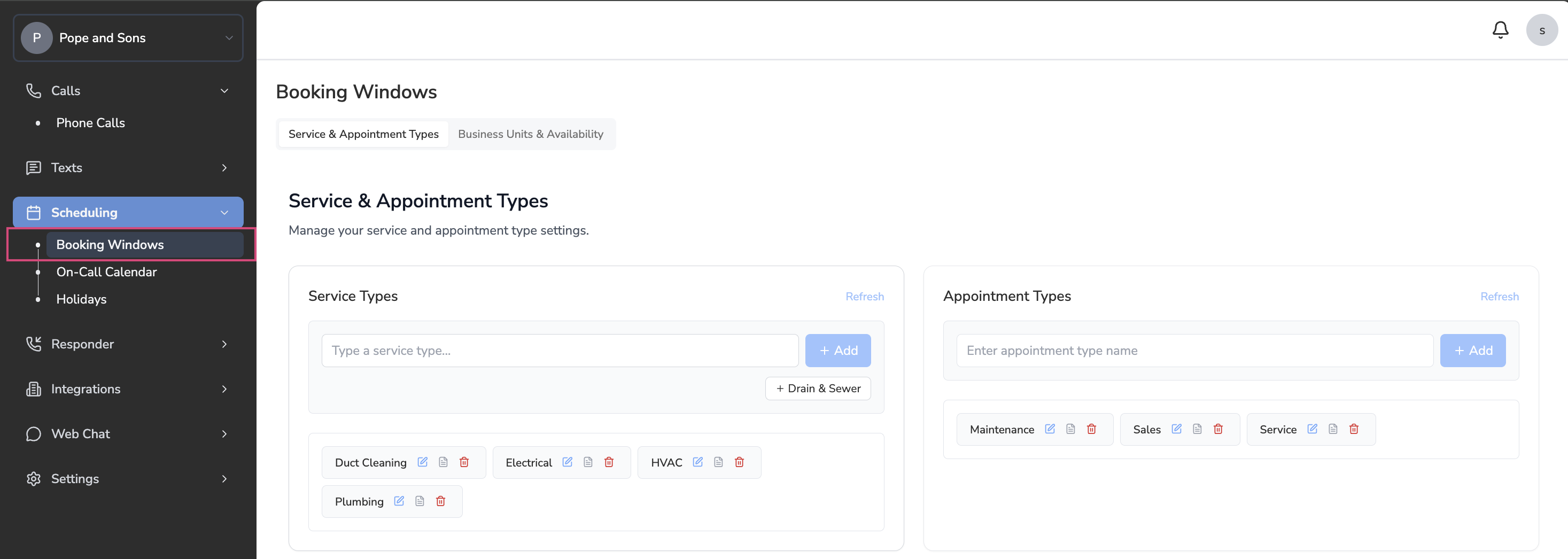 We’ve recently added a self-serve module for customers on Service Titan to manage their company holidays directly in the Avoca Dashboard. Adding your holidays will ensure that your Avoca Bot does not overbook your team on these days.This will only work if you’re configured to use Booking Windows.You can verify if you are on booking windows by going to Scheduling > Booking Windows, and check if you have Service and Appointment Types configured.