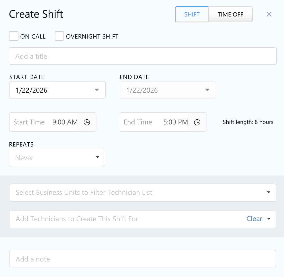 Technicians have correct weekly shift templates and Time offs entered.